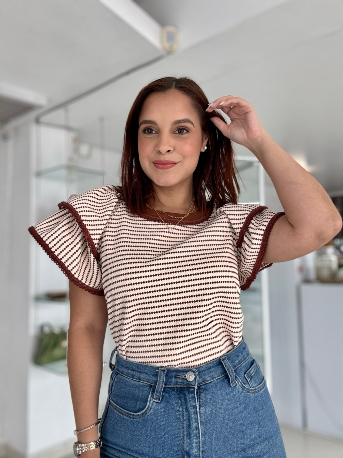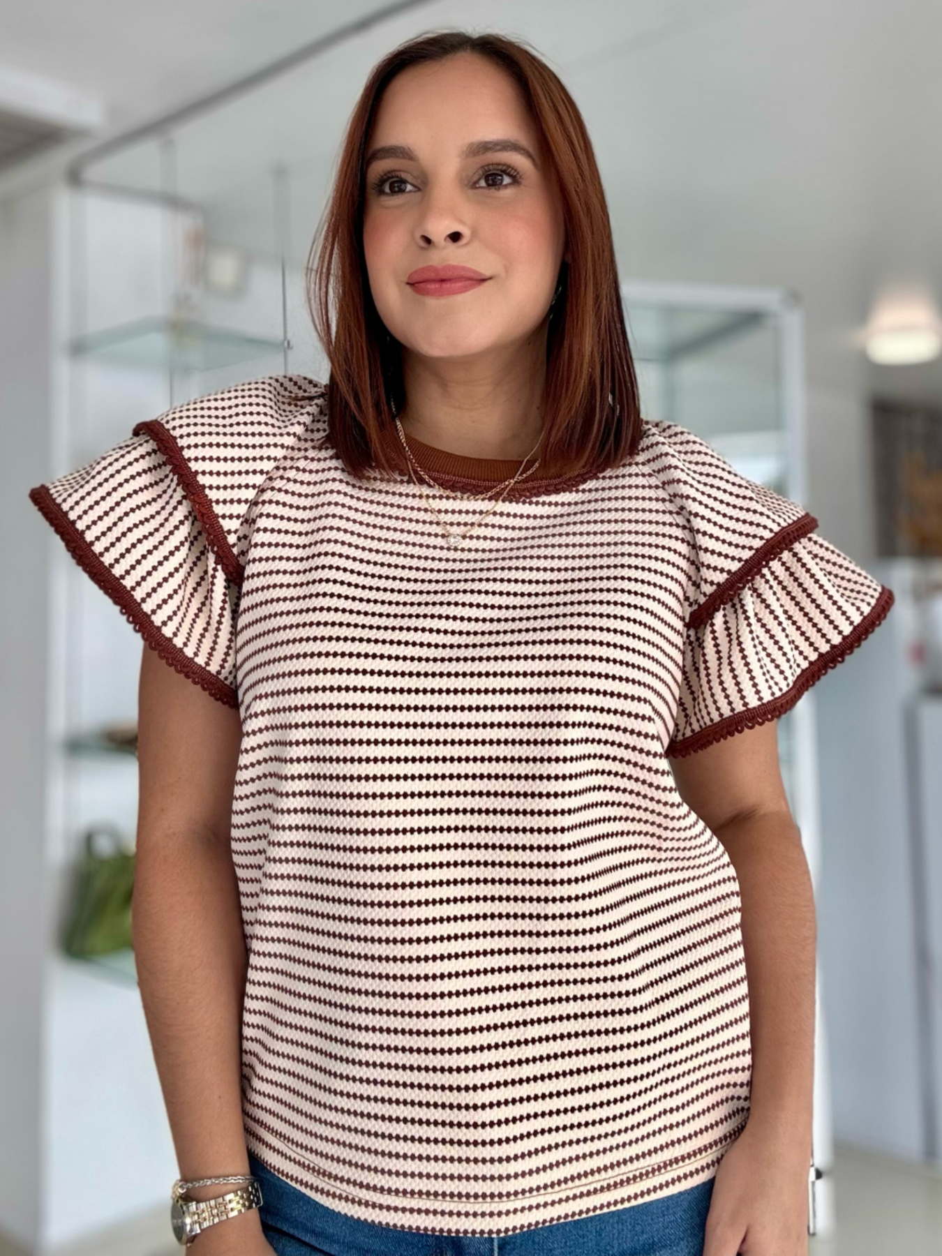 Introducing the Ruffle Sleeve Ivory & Choco top - a stylish and versatile addition to your wardrobe. With its unique ruffle sleeves, this top adds a touch of femininity to any outfit. Made with high-quality materials, it offers both comfort and durability. Perfect for any occasion, from work to a night out.