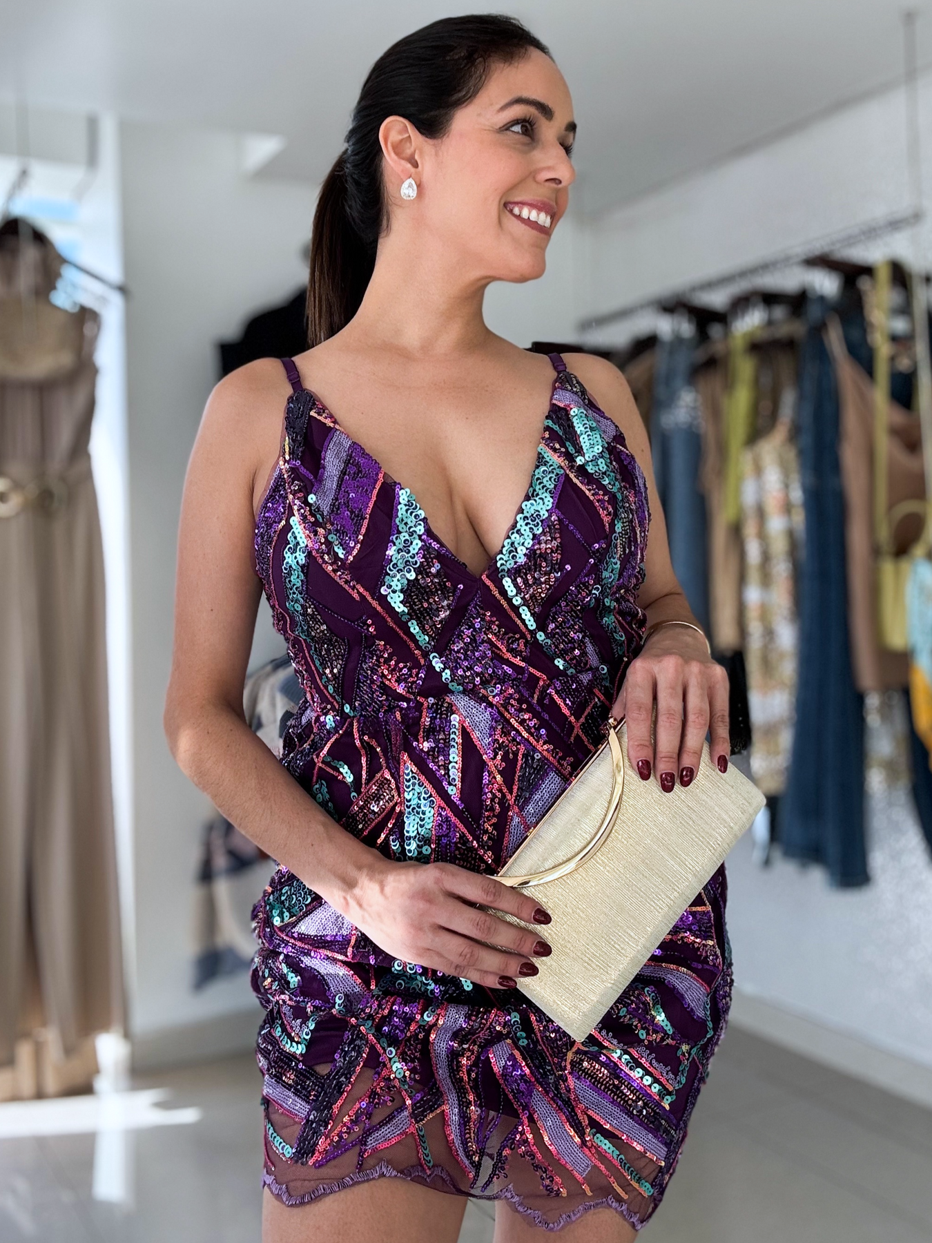 This Sequin V-Neck Mini Dress in Purple Multi is a stunning addition to any wardrobe. With its eye-catching sequin design and flattering v-neckline, this dress is sure to turn heads. Perfect for a night out, this dress will make you feel confident and elegant.
